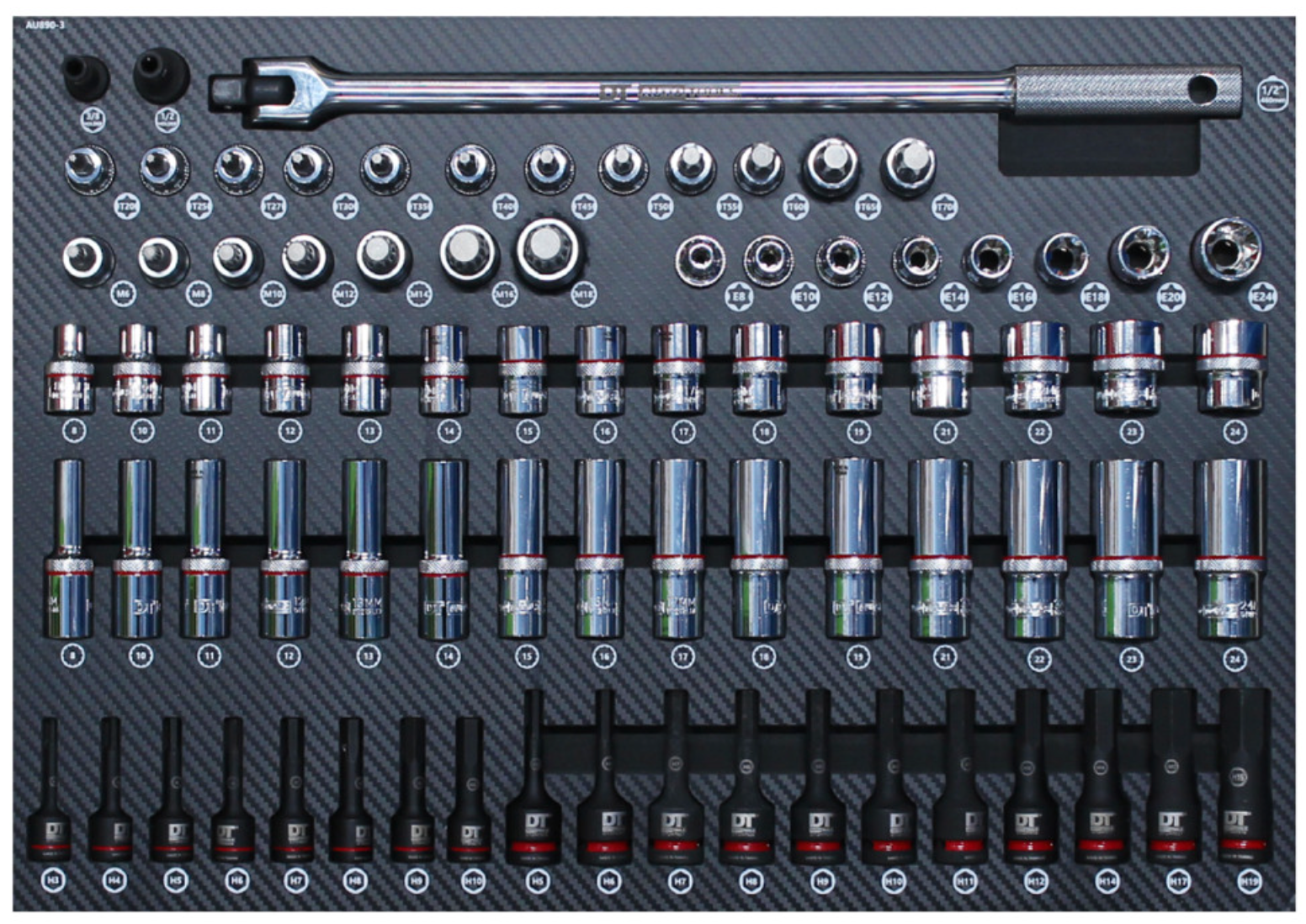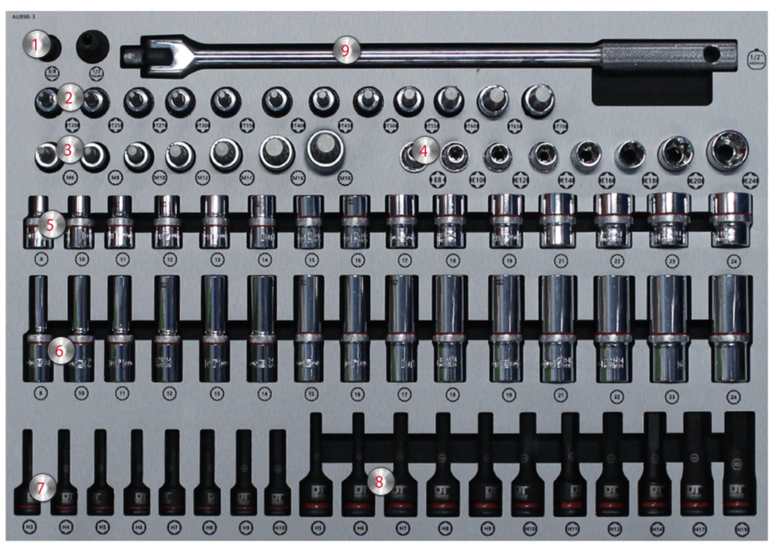| 6 | 1/2" 12pt Socket LONG | 8, 10, 11, 12, 13, 14, 15, 16, 17, 18, 19, 21, 22, 23, 24mm | 15 |