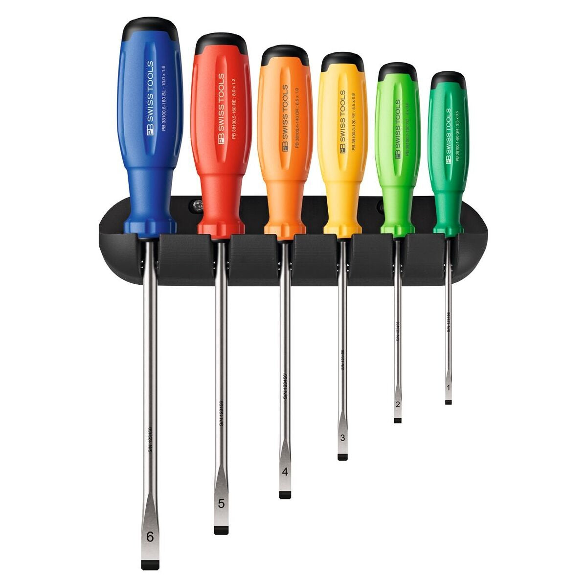 Blade of PB Swiss Tools special alloy combines maximum hardness with exceptional toughness. Surface nickel-plated and chrome-plated. Black tip. Stepped plane parallel tips provide full-surface instead of linear contact, enabling higher torque transmission. SwissGrip Evo power grip allows transmission of the required torque with no problems, even with wet or oily hands. Work without getting tired thanks to modified circular shape. High-tech 3-component materials improve the chemical and mechanical resistance.Handle with “Rainbow” colour coding for finding the correct drive size quickly Content:
