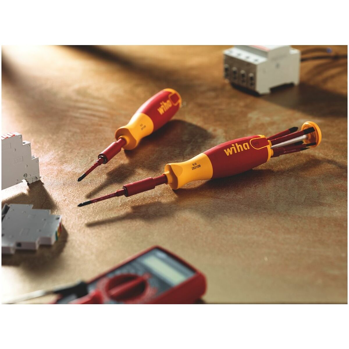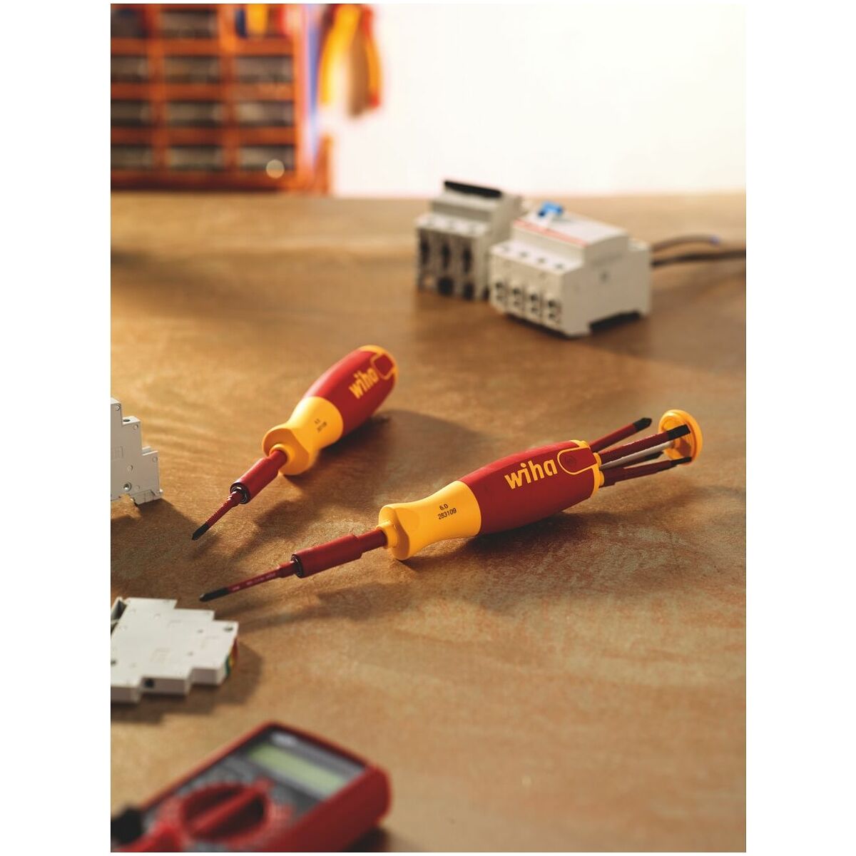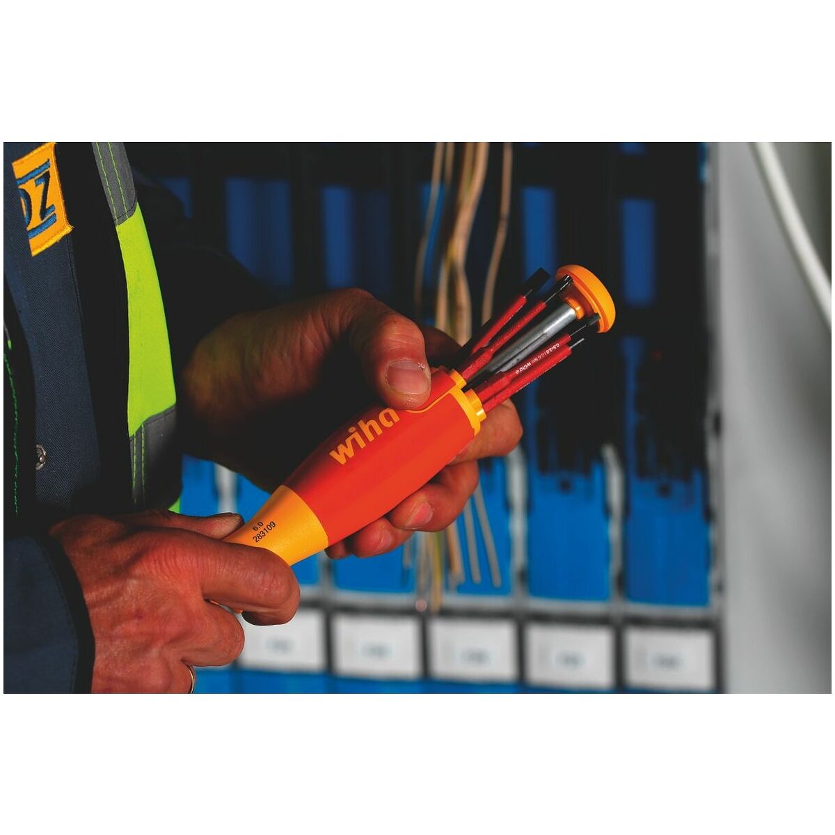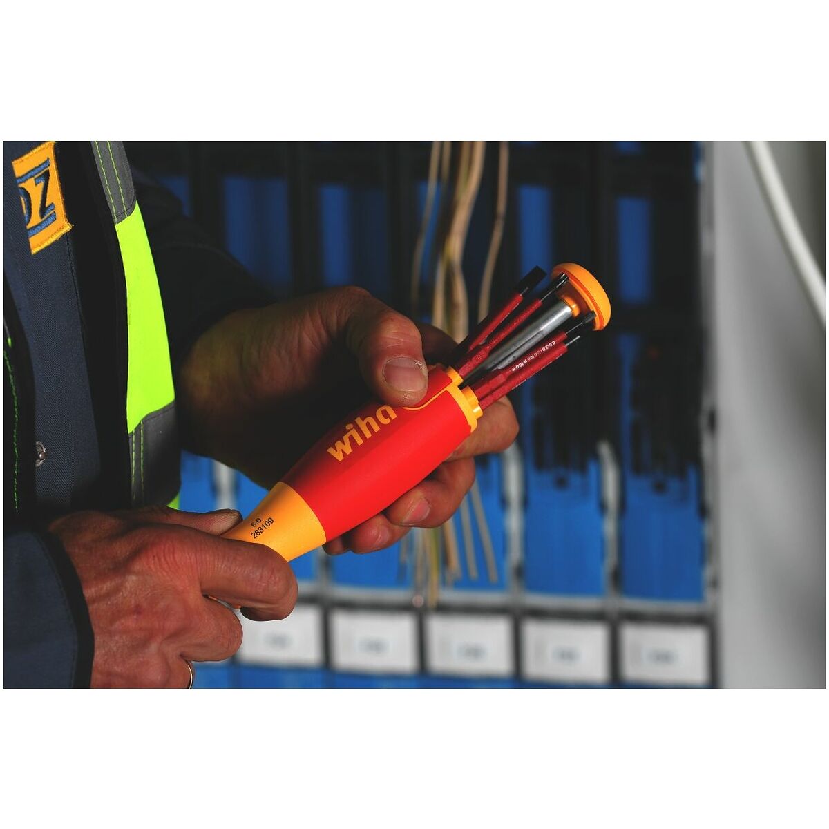 Handle and blade fully insulated up to 1000 V to DIN EN IEC 60900 / VDE 0682-201. The LiftUp electric bit magazine screwdriver is the ideal companion for any electrician when on the move. The bit storage in the handle offers space for 6 common slimBits and moves out of the magazine at the push of a button. This ensures that the bits can be removed easily. The proven ClicFix holder holds all bits securely and locks them reliably. This technology makes the bit magazine a universal screwdriver. The magazine bit holder also offers the maximum possible in terms of security. The metal bit holder holds all slimBits reliably.Increases your efficiency: