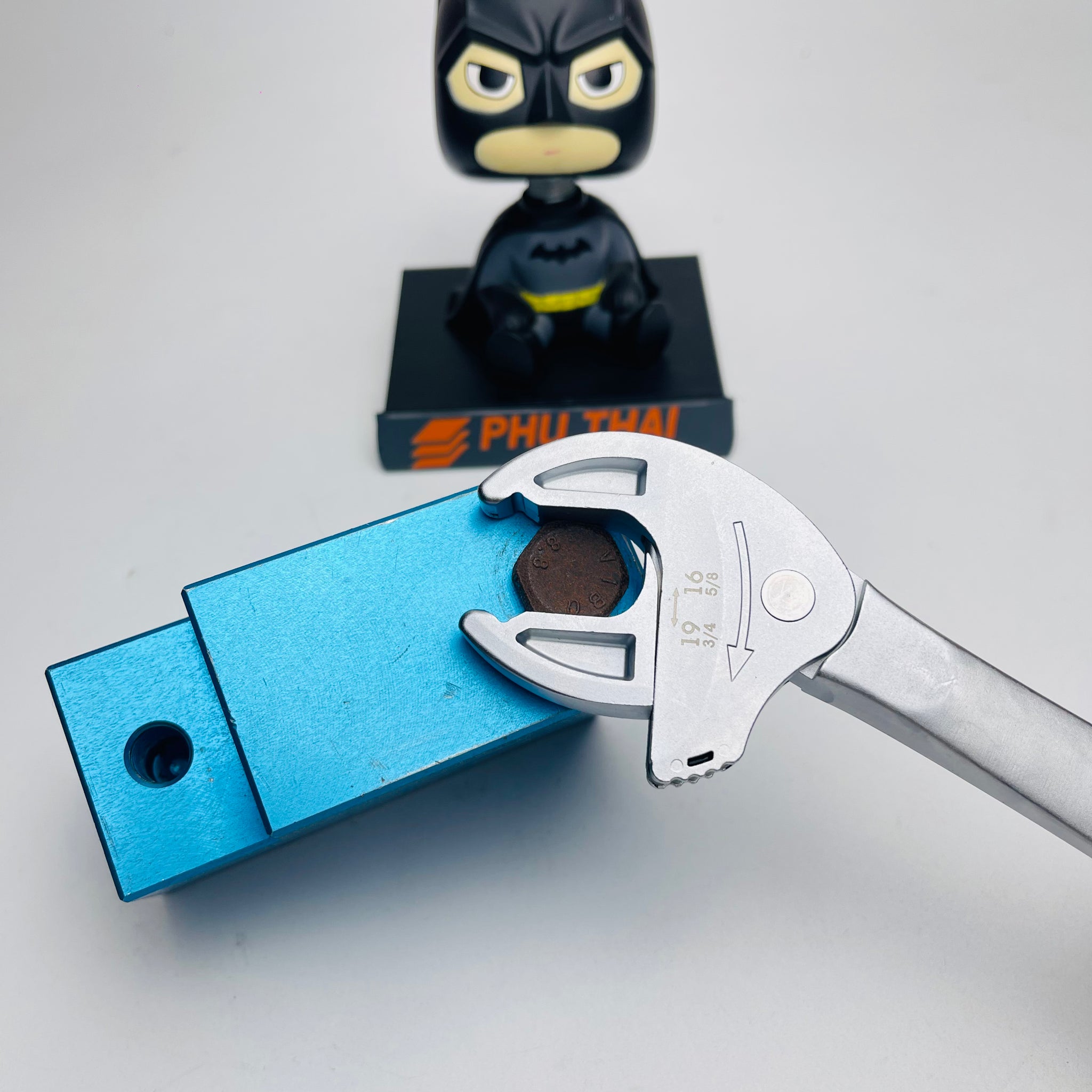 Parallel guided, smooth jaws. New stepless self-adjustment by easy seating on hex-head bolts and hexagon nuts. Quick and secure screw fastening without removing the socket insert, due to the mechanical ratchet function. Lever mechanism when gripping avoids slippage and damage. Particularly small backswing angle of only 30° due to the Vee profiles in the head across the corners.Material: