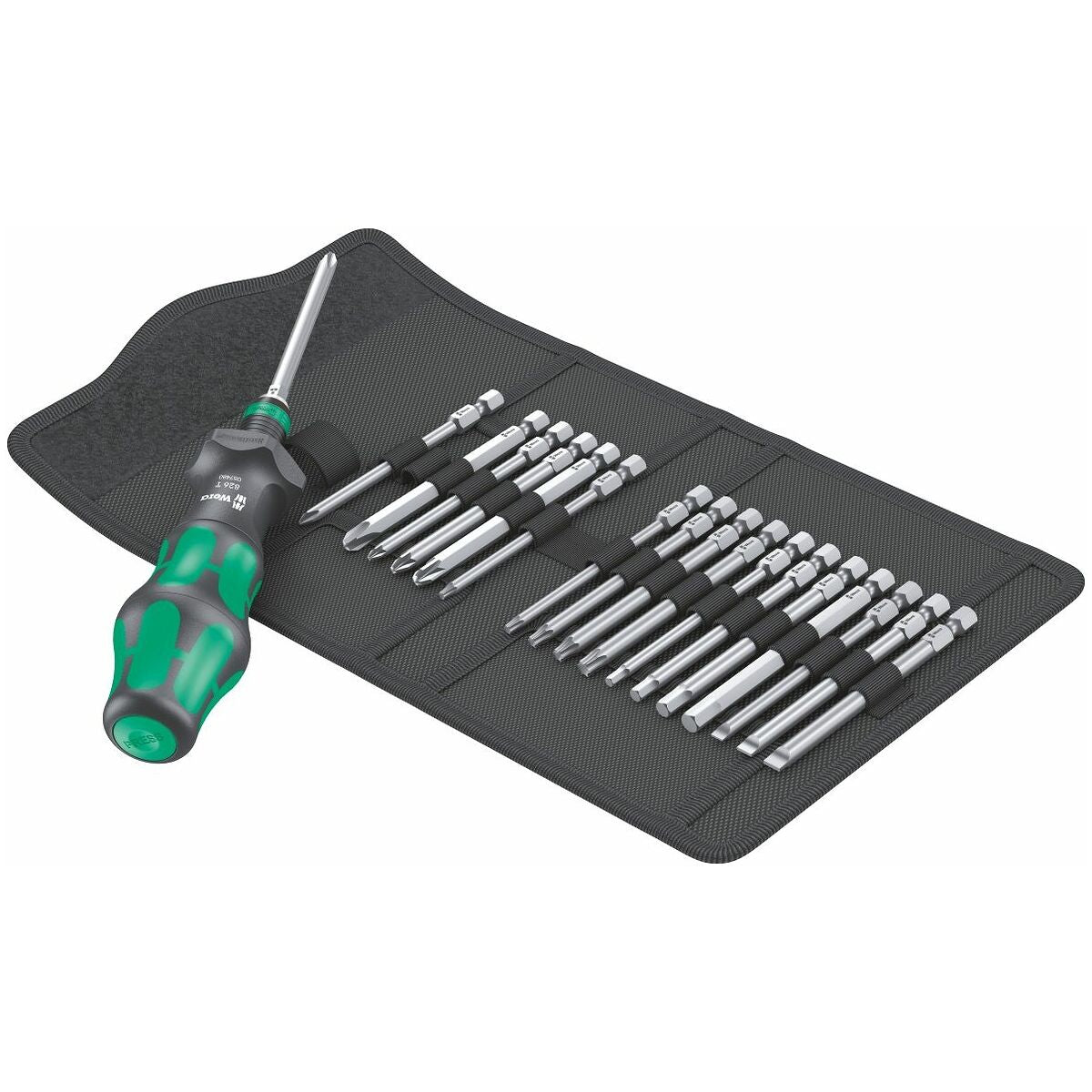Practical Kraftform Kompakt® set of bits and drive tool for manual and machine drives. Kraftform handle with quick−change holder for 1/4 inch bits with C 6. 3 and E 6. 3 shank. Up to four screw tightening speeds within a handle, optionally by the press of a button or a planetary gearbox that can be engaged/disengaged. Switching off is recommended before fine adjustment and the final tightening or release of a screw with a high torque (up to 14 Nm). Kraftform handle with Rapidaptor bit holder for 1/4 inch bits with C 6. 3 and E 6. 3 shank. Supplied in a sturdy textile tool roll with hook and loop fastener.Advantage: