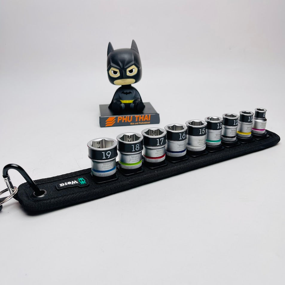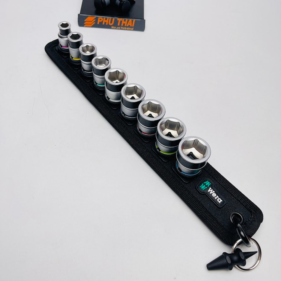 - Dây đeo dụng cụ bằng vải dệt chịu lực và thiết kế Wera, với ổ cắm 9 bit, trong một không gian nhỏ.