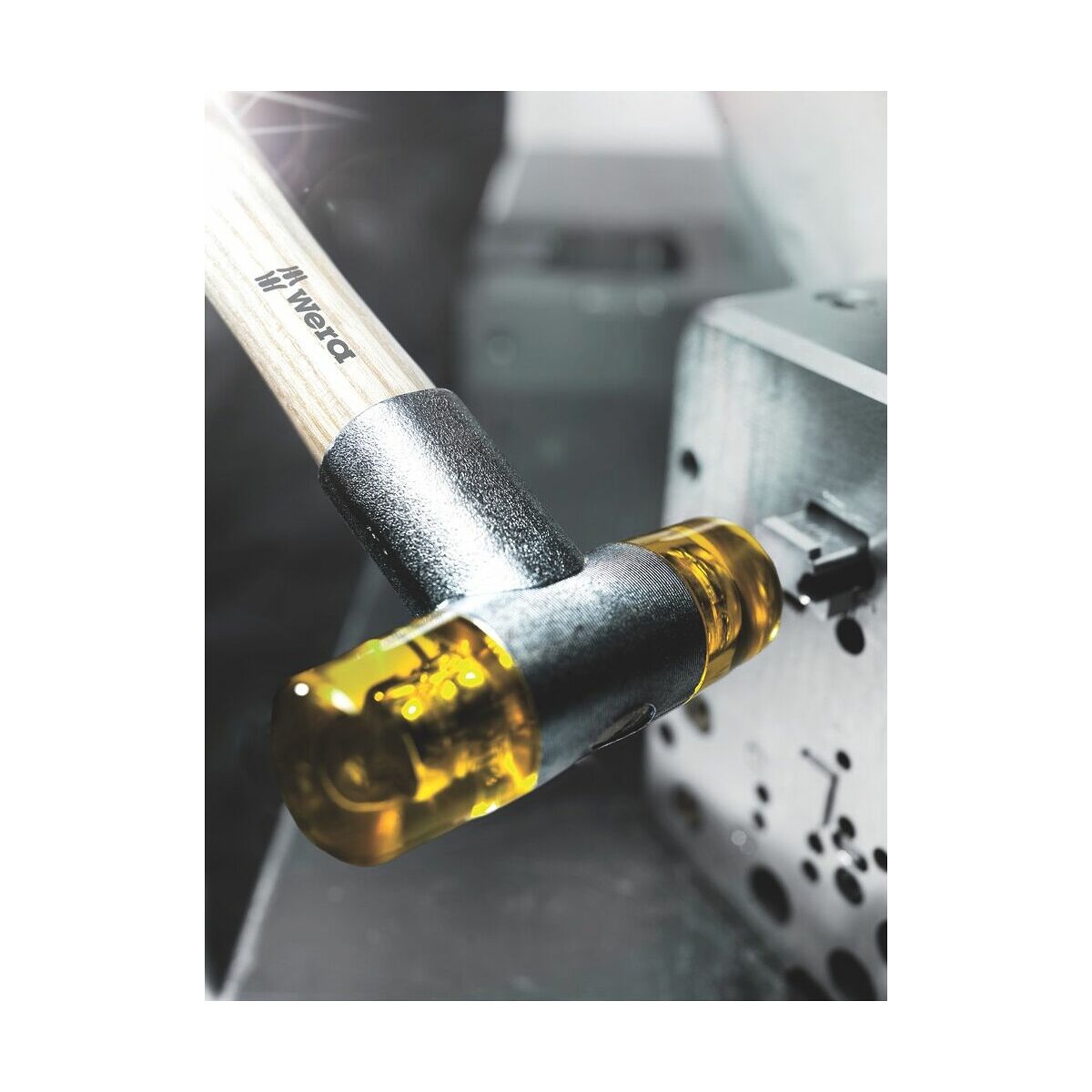 Sturdy die-cast zinc central piece with handle protection sleeve and impact resistant inserts. With cambered hammer handle. With impact resistant Cellidor inserts (yellow).Application: