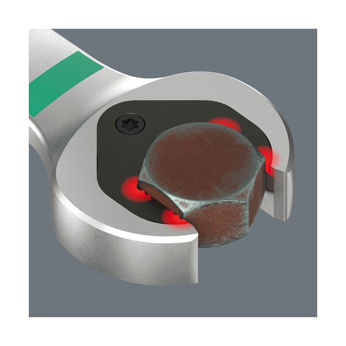 Drop-forged. Ring end with smooth-running sturdy precision ring ratchet (80 teeth) with a particularly small working arc of 4. 5°. The open end has a bi-hexagon profile and a replaceable hardened metal plate, which fulfills a stop function, preventing slippage and allowing a small working arc.Material: