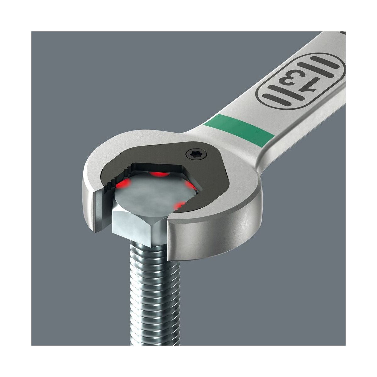 Drop-forged. Ring end with smooth-running sturdy precision ring ratchet (80 teeth) with a particularly small working arc of 4. 5°. The open end has a bi-hexagon profile and a replaceable hardened metal plate, which fulfills a stop function, preventing slippage and allowing a small working arc.Material:
