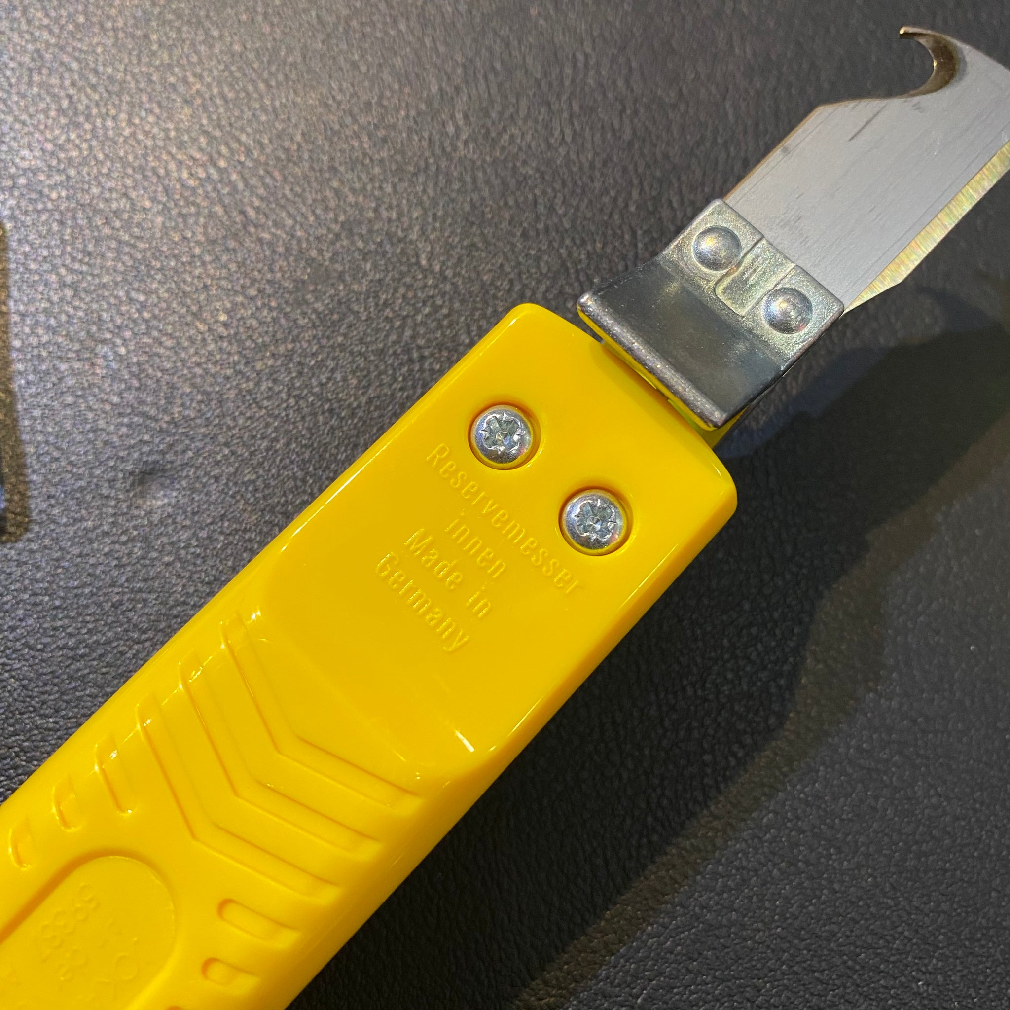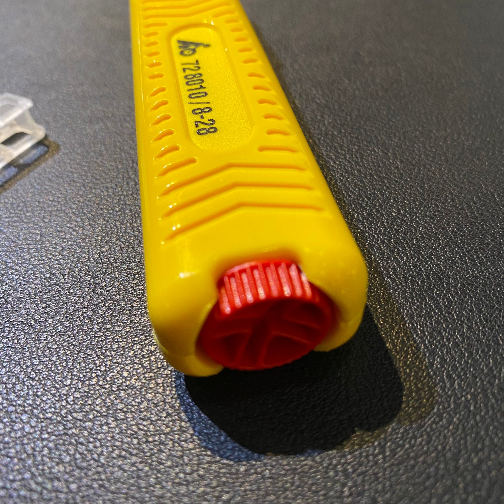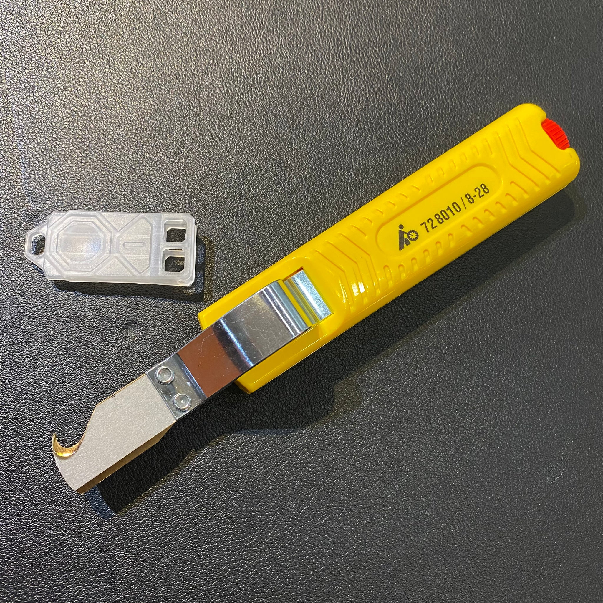 Twist knife for circular and longitudinal cut; adjustable depth of cut. The Vee-shape cable holder adjusts automatically to the required cable ⌀. The cable sheath is cut by twisting and pulling the cutter. Supplied with 1 spare blade in the handle. Knife with TiN-coated blade for longer working life.Advantage: