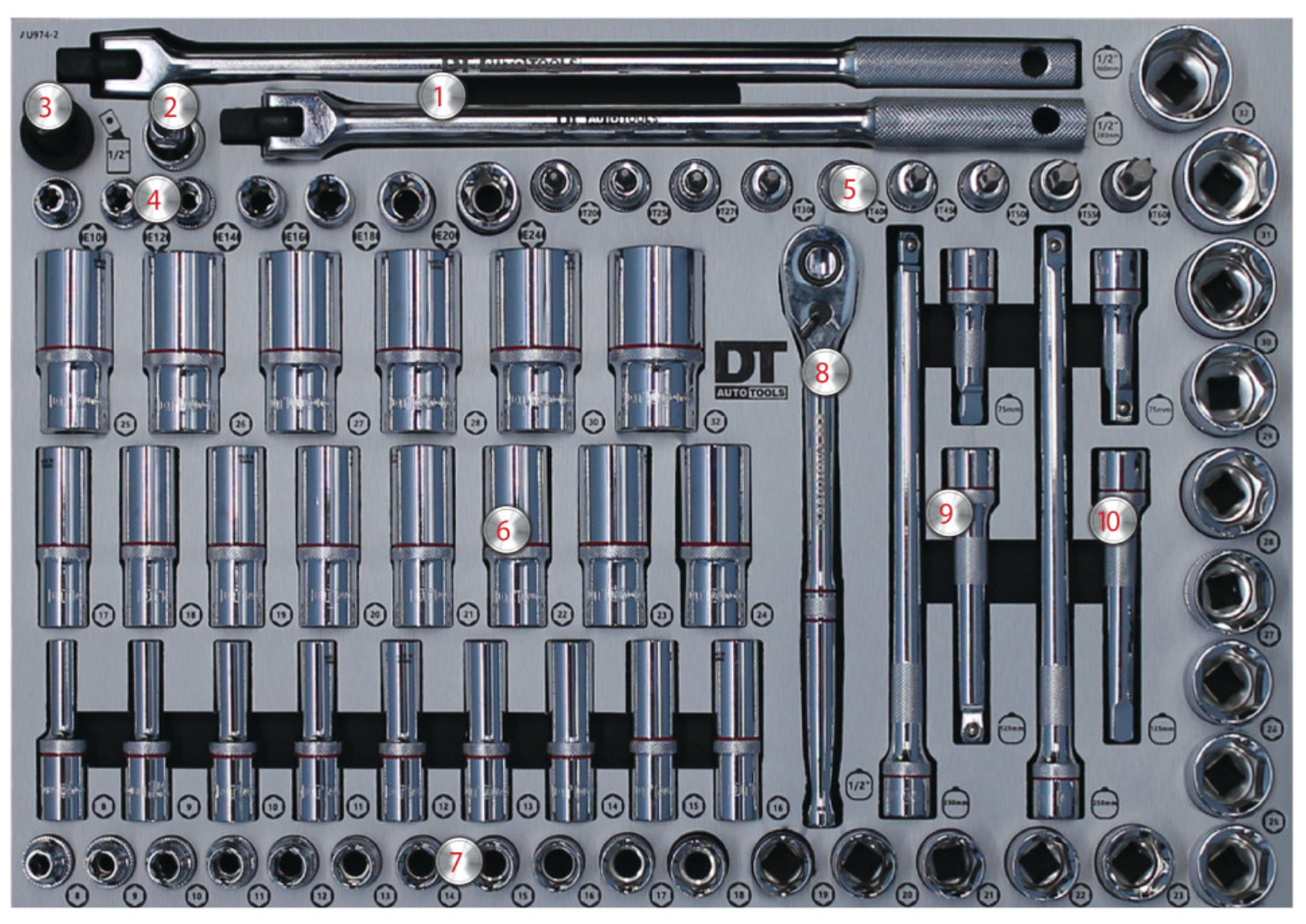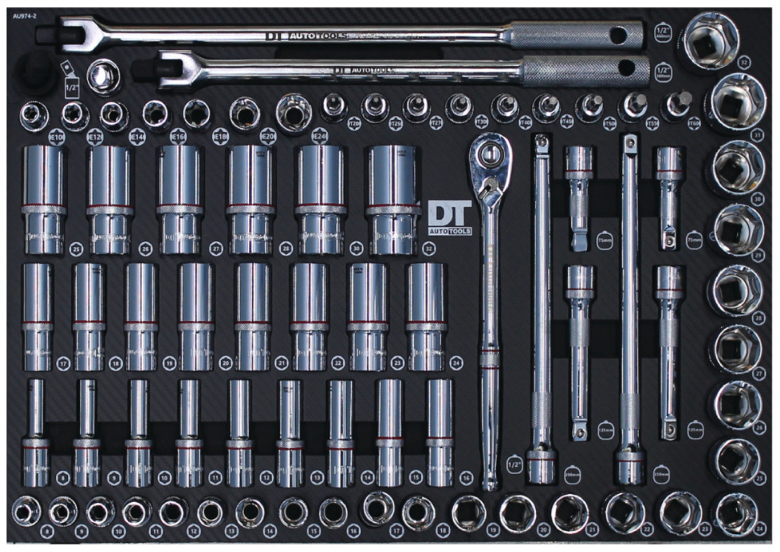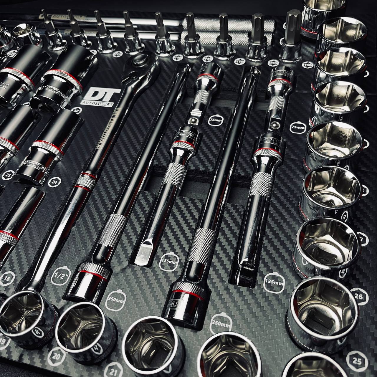 ✅ This drawer is mainly a 1/2" drive socket set including breaker bars, star sockets, Torx sockets, long & short sockets, ratchet, and extension bars.
